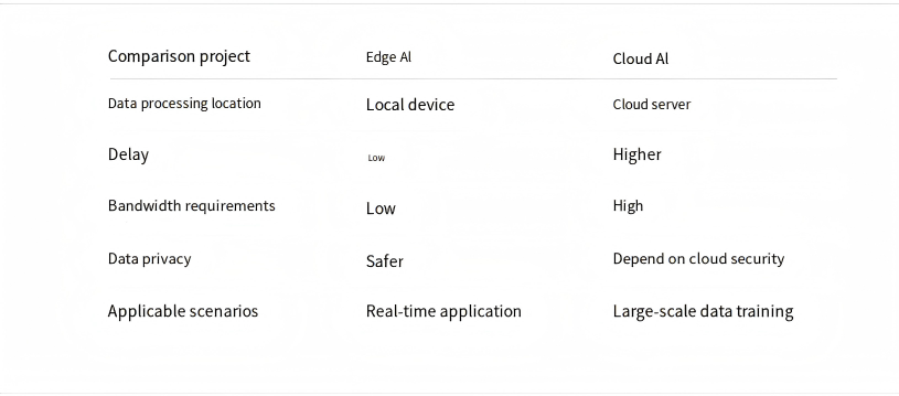 Edge AI: Focuses on low power consumption, low latency, local processing of data, deployment at the terminal, protection of privacy, and saving bandwidth.
