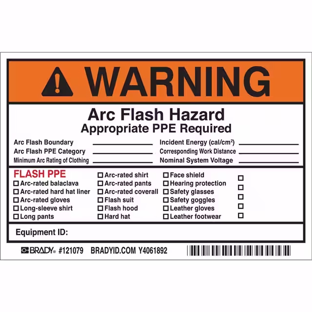 - | Bulk | Active | Pre-Printed | English | Safety: Warning | Symbol and Text | Warning : Arc Flash Hazard. Appropriate PPE Required. Arc Flash Boundry. Arc Flash PPE Category. Minimum Arc Rating Of Clothi… | - | Warning | Orange, White | Personal Protection (PPE) | Black, Red | 6.000" (152.40mm) | Adhesive, Permanent | 4.000" (101.60mm) | - | Vinyl | - | Outdoor | Rectangle | - |