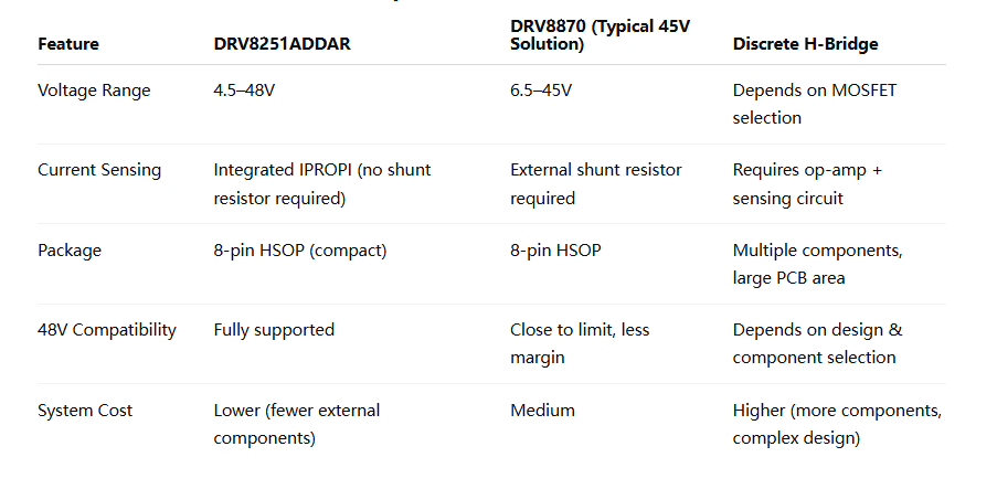 Although 48V brings advantages, it also faces new problems. The increase in circuit design complexity, the high BOM cost of discrete MOS solutions, the tendency for motors to lock up and damage the system, and the increase in difficulty in heat dissipation and protection design. This is precisely the opportunity for highly integrated driver ICs. Under this trend, DRV8251ADDAR has become a very competitive solution.