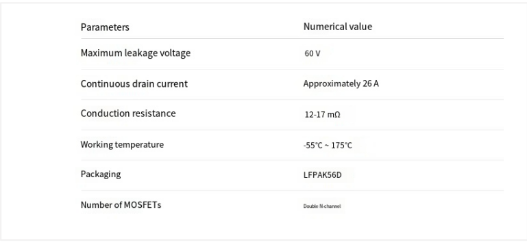 Sturdy packaging and reliability, the LFPAK56D package provides excellent thermal performance, effectively conducting the heat generated by the chip to the circuit board.